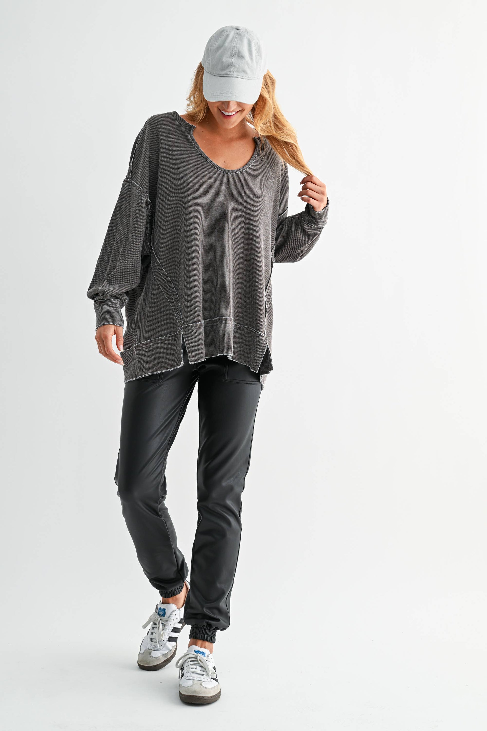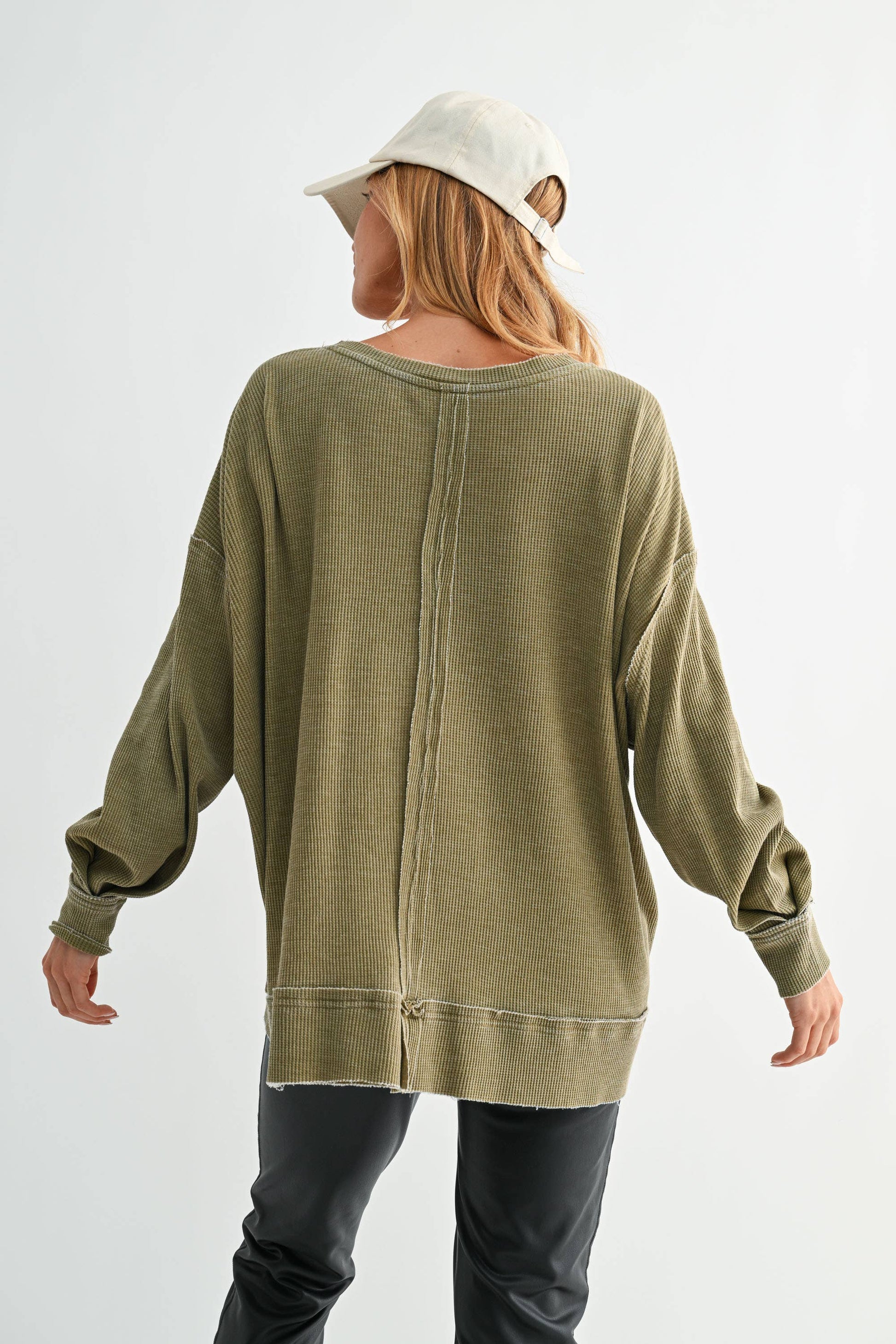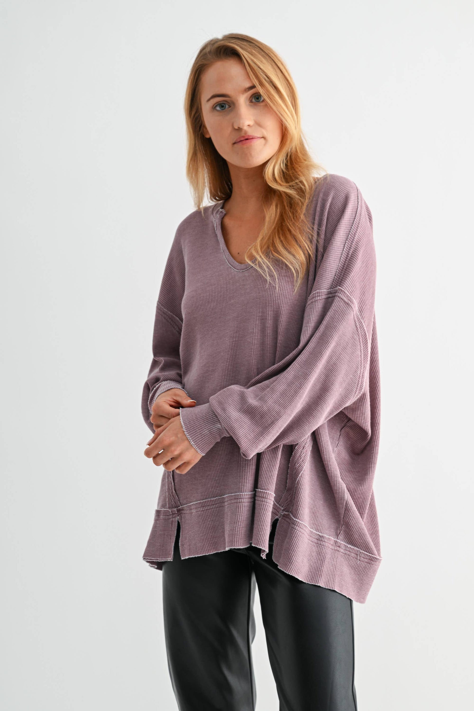 Embrace effortless style with our Oversized Waffle-Knit Distressed Long Sleeve. This piece features a unique mineral wash and raw edges at the seam lines for an edgy, worn-in look. The slits at the hem create a flowy, relaxed fit, while inverted pleats at the sleeve cuffs add fullness, giving the sleeves a subtle yet stylish volume. Perfect for layering or wearing on its own, this top is a go-to for those who love a blend of comfort and fashion-forward design.