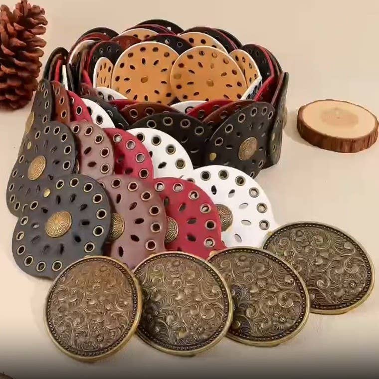 disc belt, statement waist belt, grommet belt, edgy fashion accessory, bold waist chain, festival belt, Y-shaped belt, punk belt, fashion waist wrap, metal ring belt, modern belt for dresses, waist cincher.