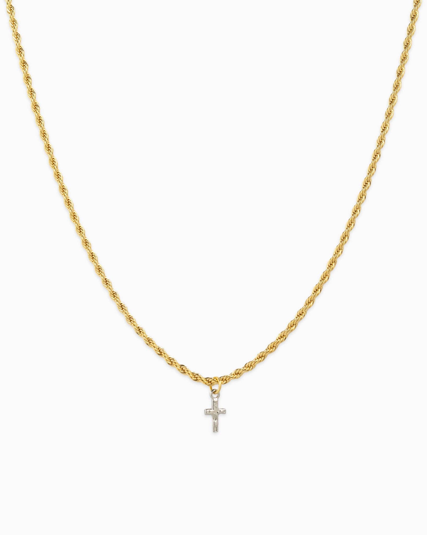 A bold and minimal piece featuring a textured cross charm on a twisted rope chain. Two-tone design, blending silver and gold for a trending look.